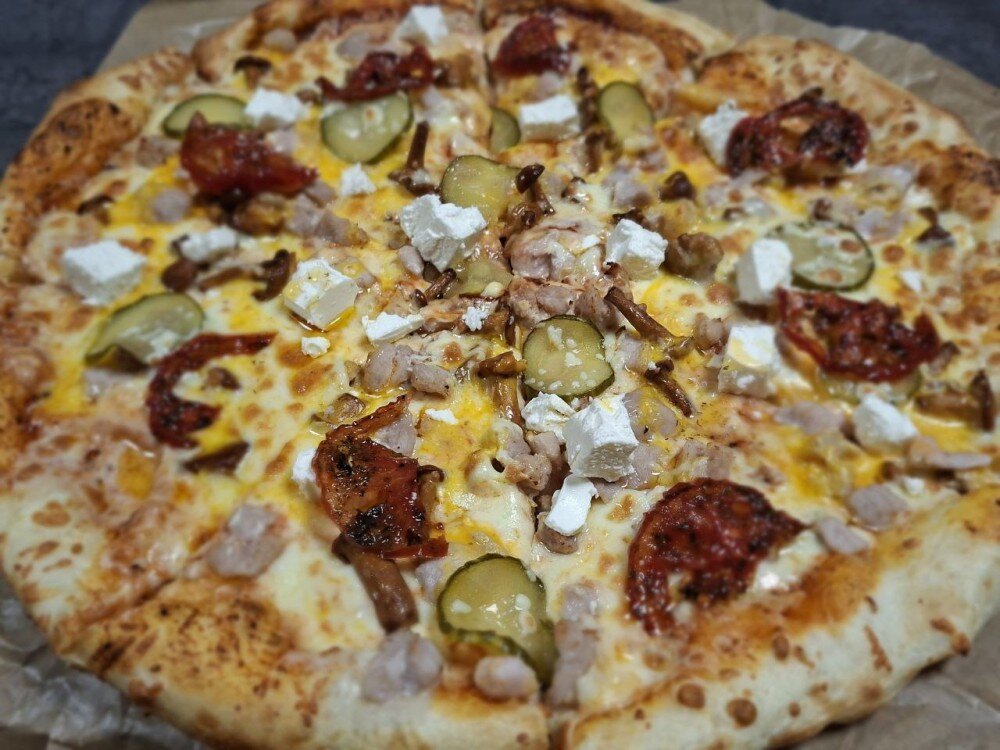Хрустяцие лисички ,сочное мясо,маринованые огурцы,вяленые томаты ,сыр, соус Венеция и соус Чеддер