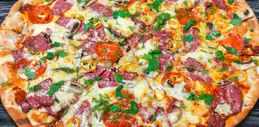 соус Венеция, пепперони, салями, карбонат, фарш говяжий, сыр, помидоры, болгарский перец, белый соус